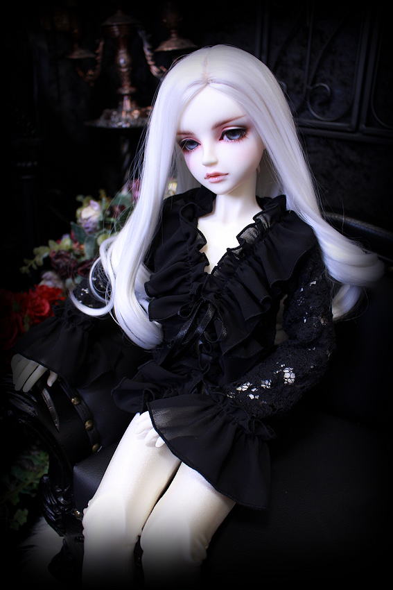 黒薔薇のニット素材にシフォンのフリルを施しましたフリルブラウスです。