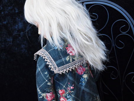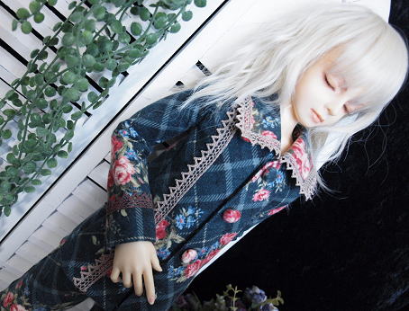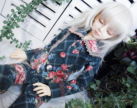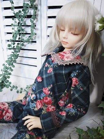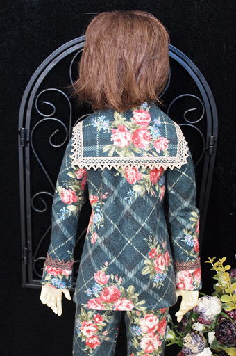 大判のチェック柄にブーケが飾られた冬素材の衣装です