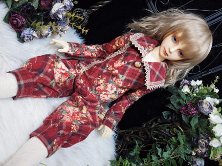 大判のチェック柄にブーケが飾られた冬素材の衣装です