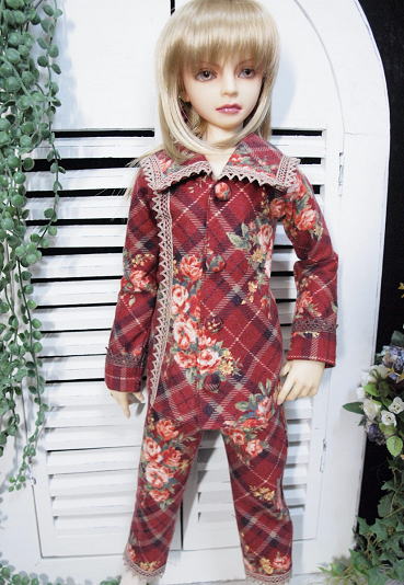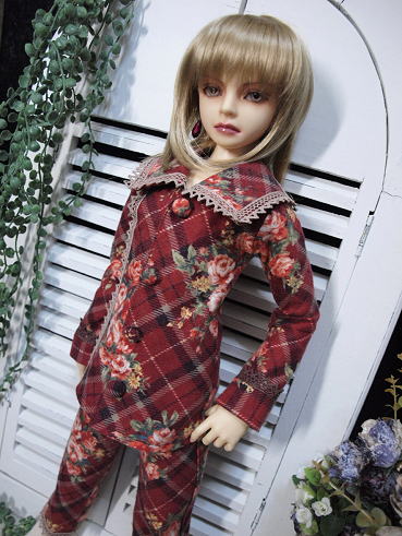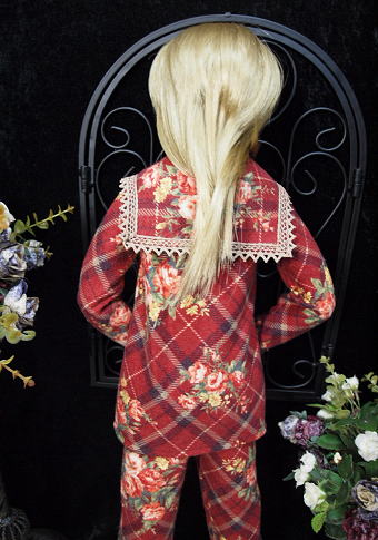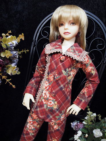 大判のチェック柄にブーケが飾られた冬素材の衣装です