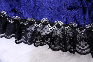 光沢のある生地とブラック×シルバーの飾りブレード、タックの施されたラッセルレースを使用し、
