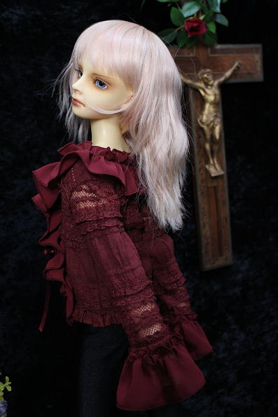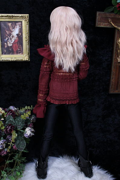 落ち着いたローズワインのアンティークフリル風ニットを使用。