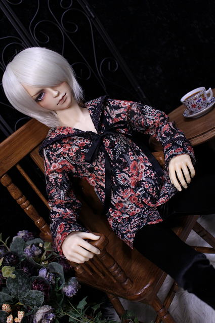 襟元と袖口にくすみ紫の薔薇ブレードを施しています。