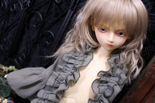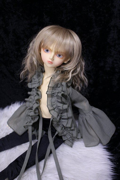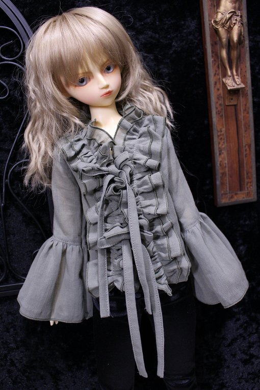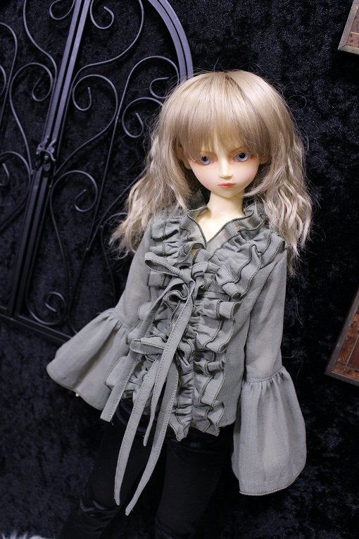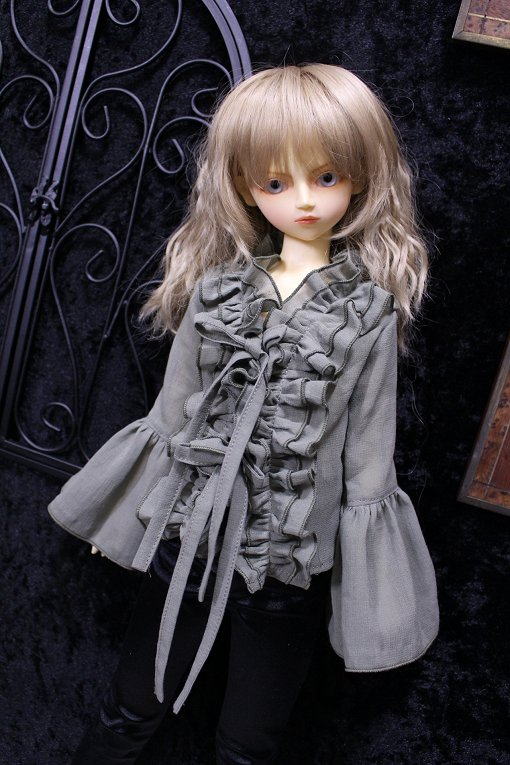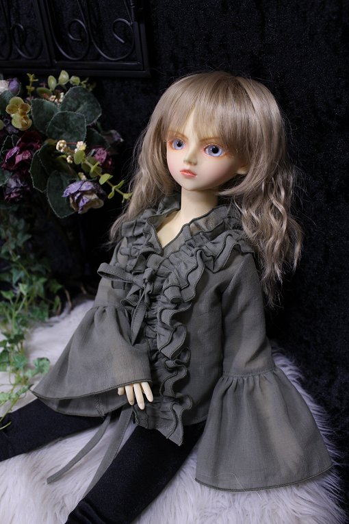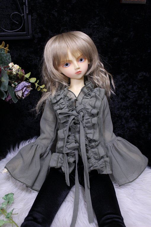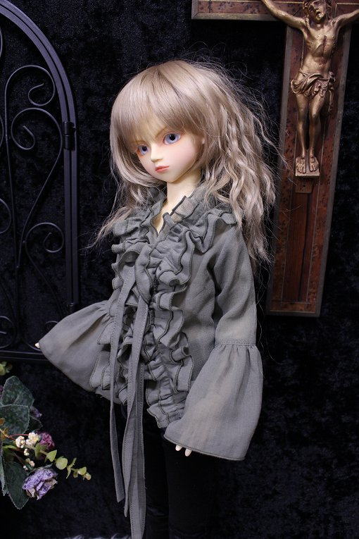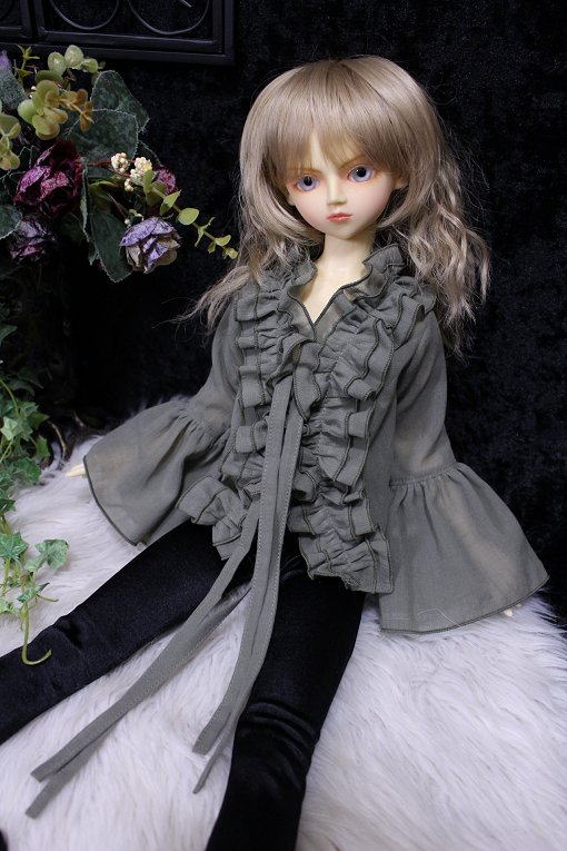 graysh herb frill blouse for SDB 陽だまりに集まる天使をイメージした柔らかで軽やかな風合いの作品集続編です。 サイズはSD少年。 素材は自然素材100%の綿シフォンを使用。 透け感が多く軽い素材です。 使いこむほどに愛着が得られるような そんな一着になりました。 フロントにて共布紐2点留め。 カラー:グレイッシュハーブ