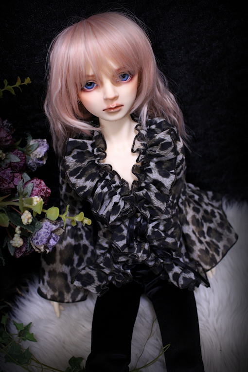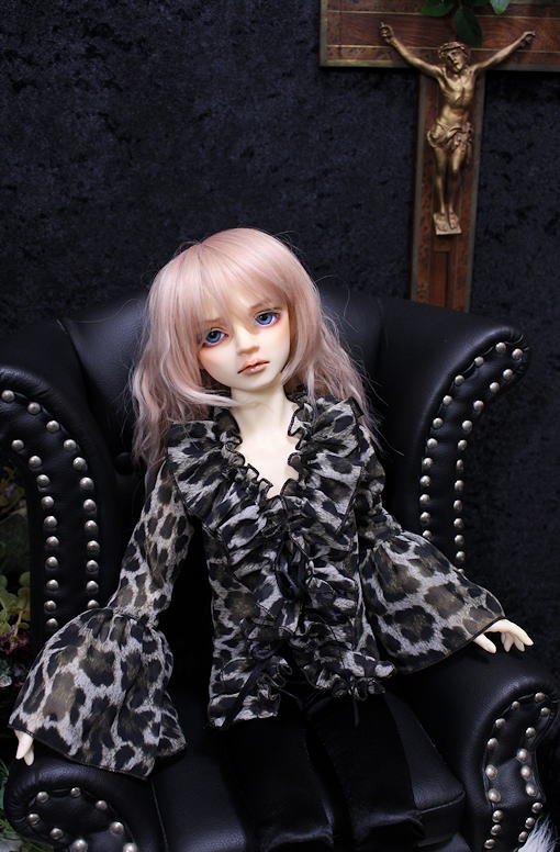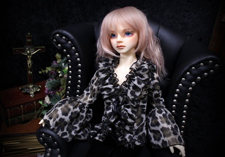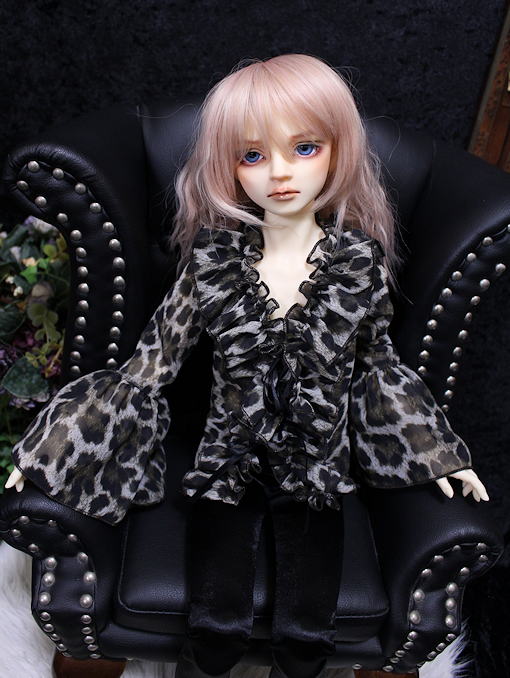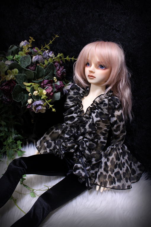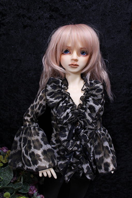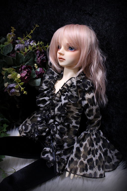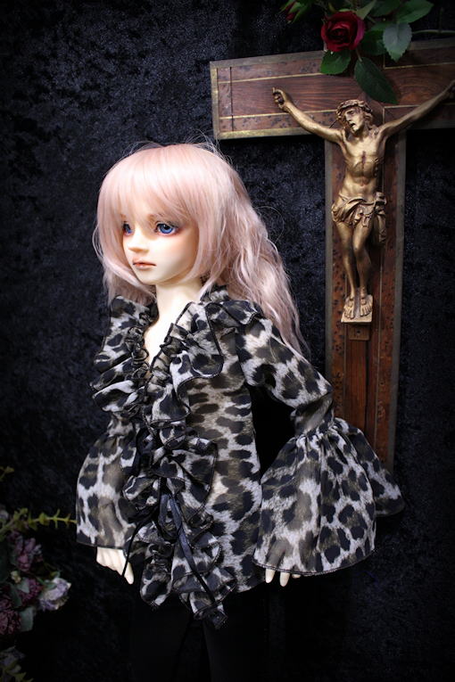 Leopard frill SD13B/SDGrB frill blouse レオパード柄プリントのシフォンジョーゼットを使用したフリル作品。 シワになりにくくとても扱いやすい 落ち感に優れた一着です。 フロントにて両面サテンリボン2点留め モデルはSD13B revival bodyです