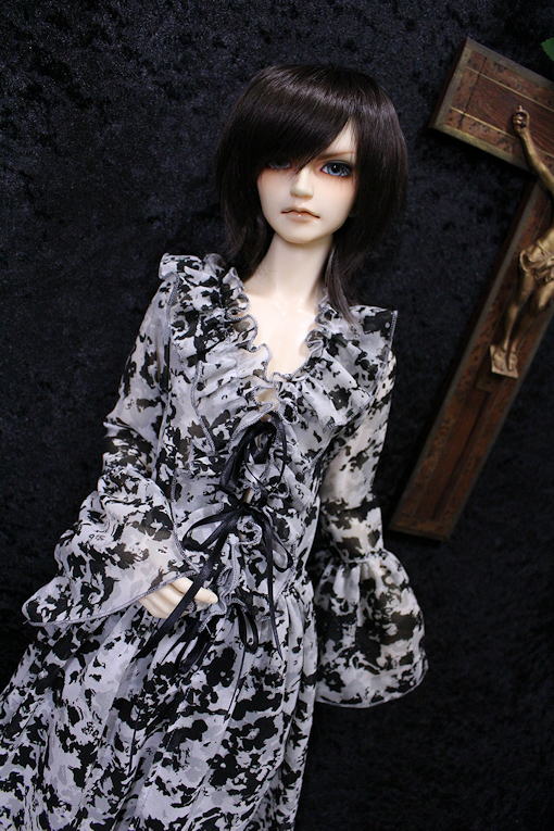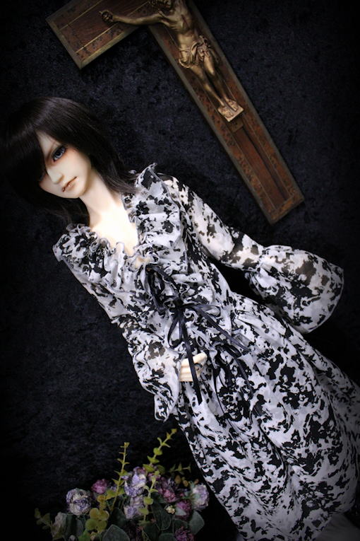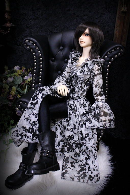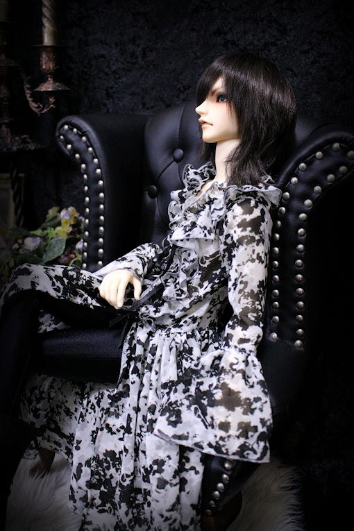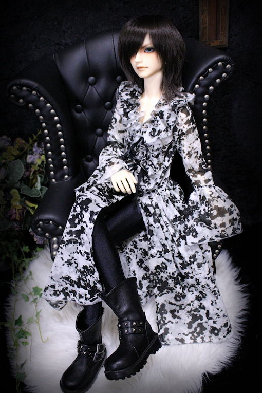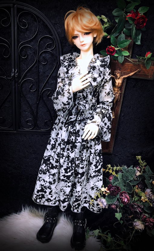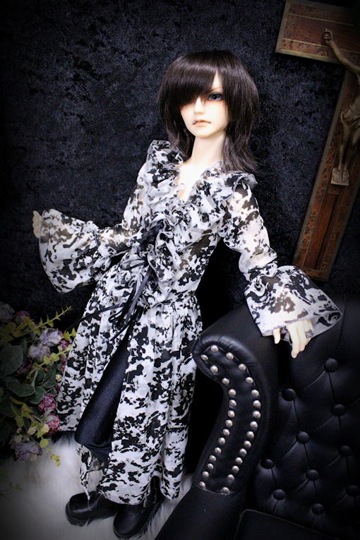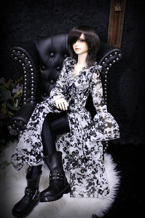 白地に黒い血痕のような個性的なプリントのシフォンジョーゼットを使用したフリル作品。
