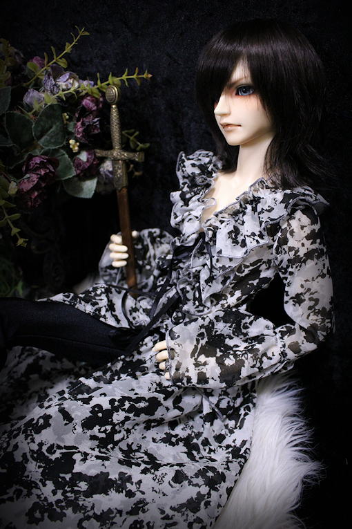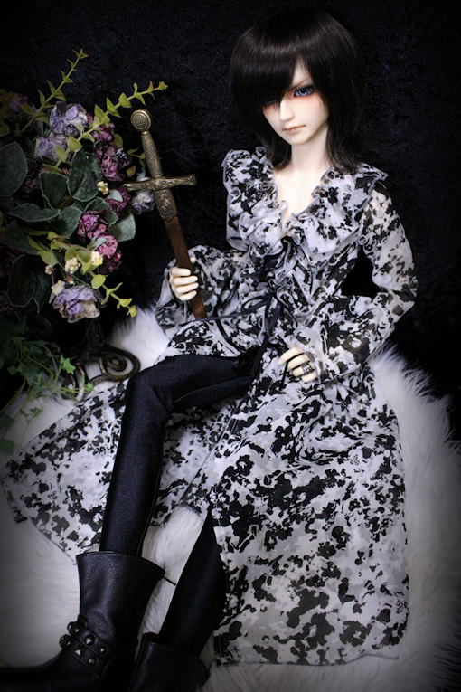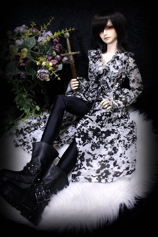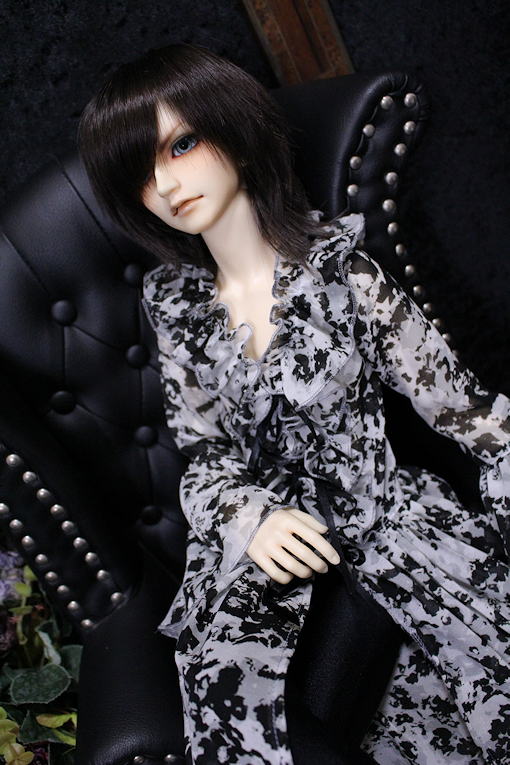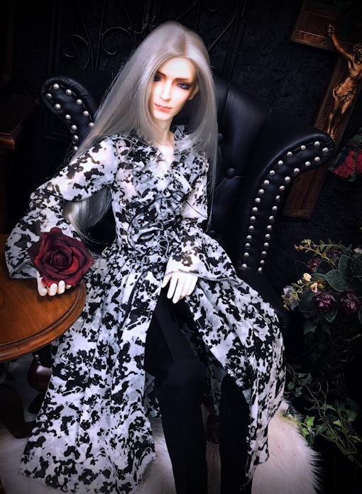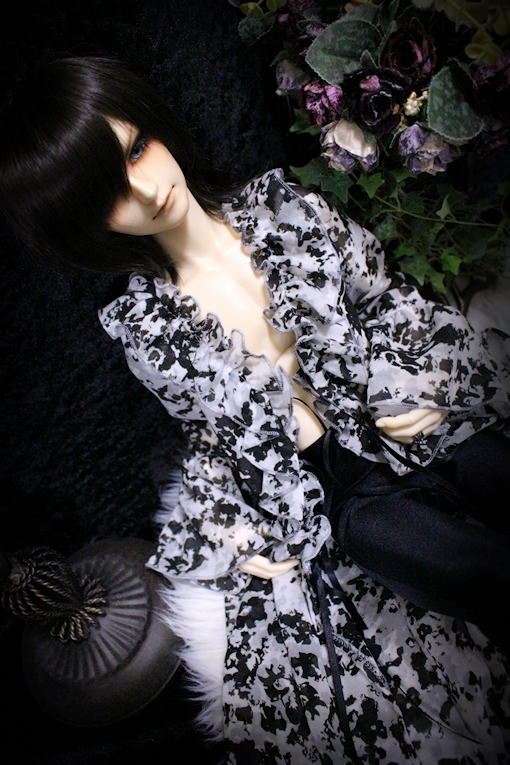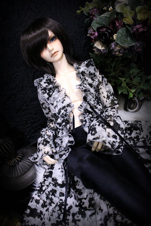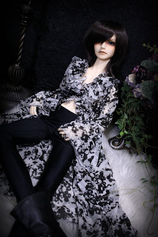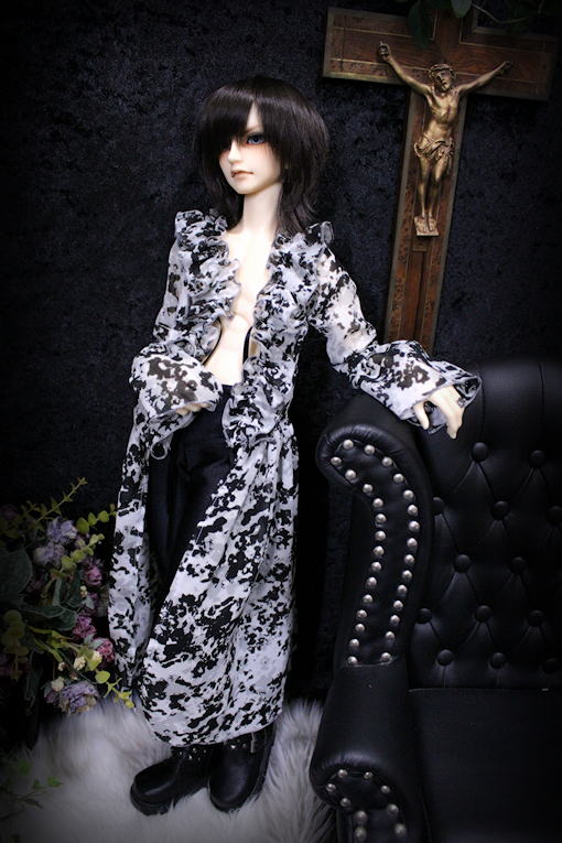 白地に黒い血痕のような個性的なプリントのシフォンジョーゼットを使用したフリル作品。