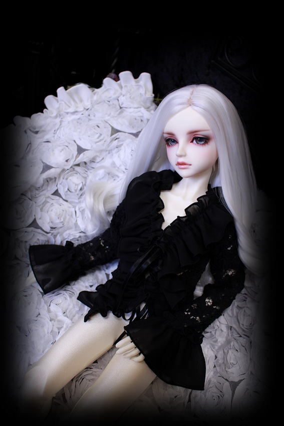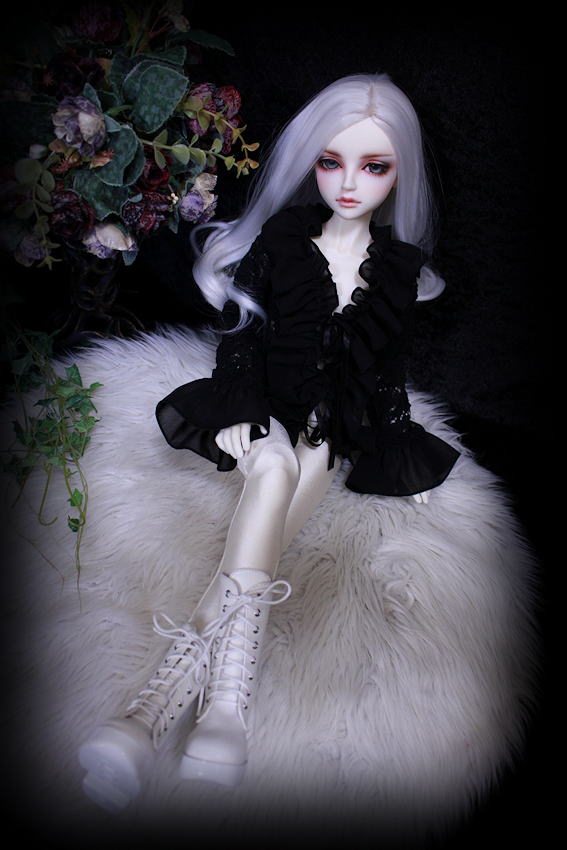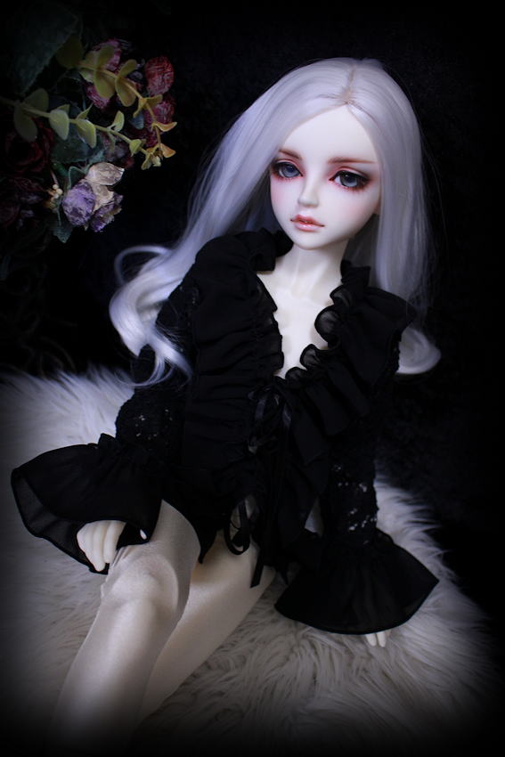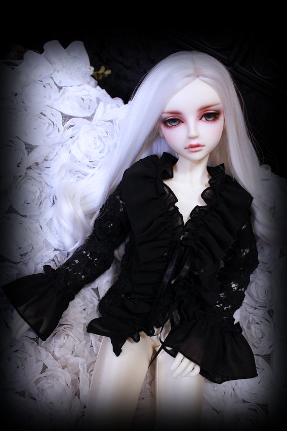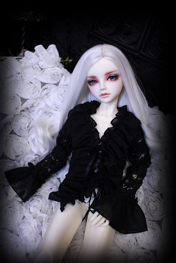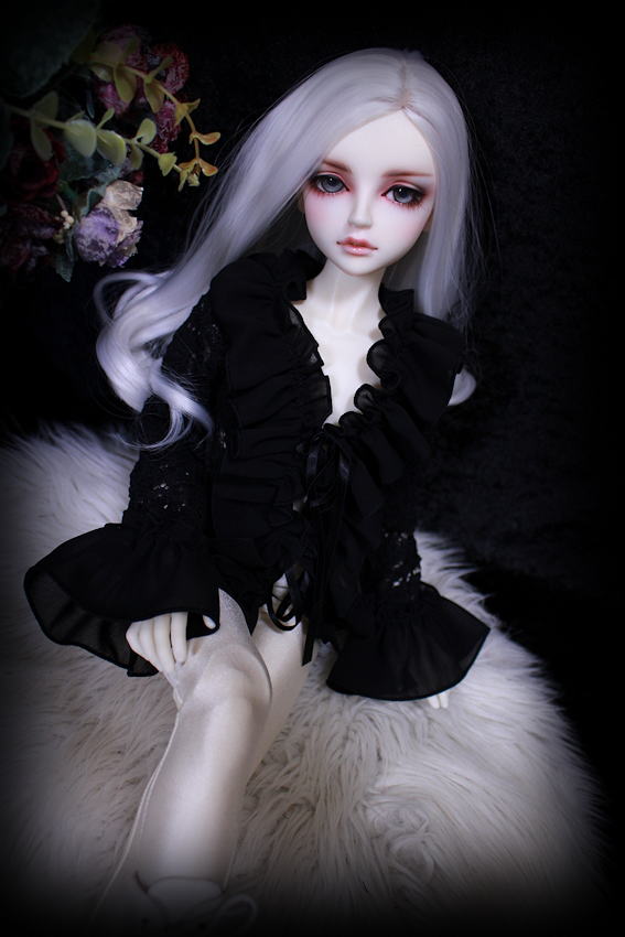 黒薔薇のニット素材にシフォンのフリルを施しましたフリルブラウスです。