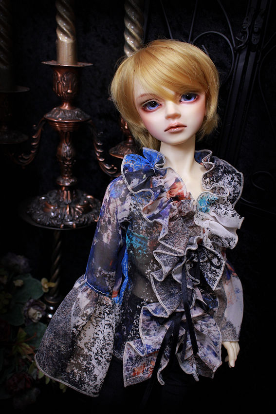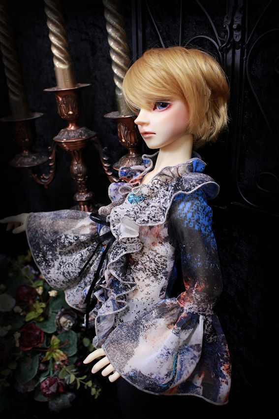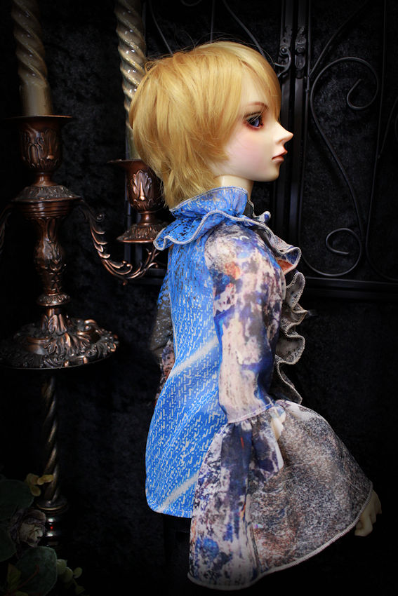 Costa rocciosa frill blouse for SDGrB Costa rocciosa~岩だらけの海岸 抽象柄の薄手のシフォンジョーゼットを使用。 透け感があります。 ごつごつとした岩だらけの海岸。時々覗く青は断崖に打ち付ける波。 そんなイメージを載せたシフォンフリルブラウスです。 フロントにてサテンリボン2点留め。